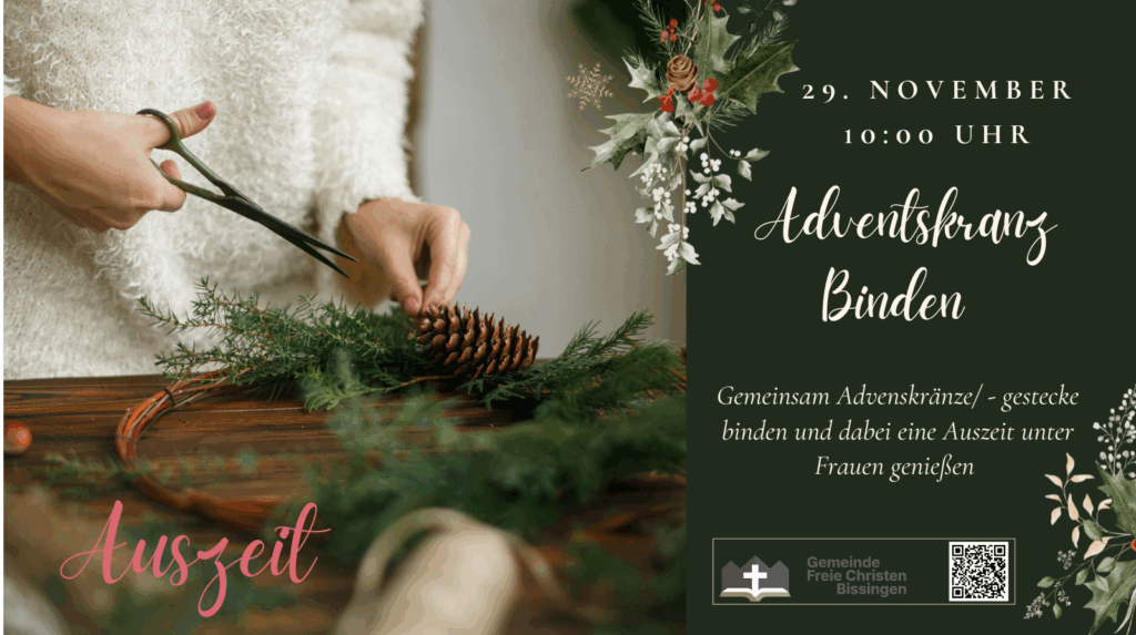 Hier könnt ihr gemeinsam kreativ werden und eure eigene Adventskränze binden. Nebenbei genießen wir die Zeit unter Frauen, mit wertvollem Input und guter Gemeinschaft.